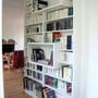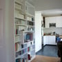 Le coin cuisine a été totalement repensé et relier à la partie Salon par un espace Bureau-Bibliothèque pris sur un couloir qui ne servait à rien. Pour ce faire, une ou deux cloisons ont été abattues et la lumière fait désormais parte intégrante de ce passage.